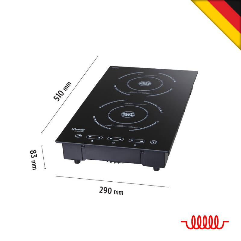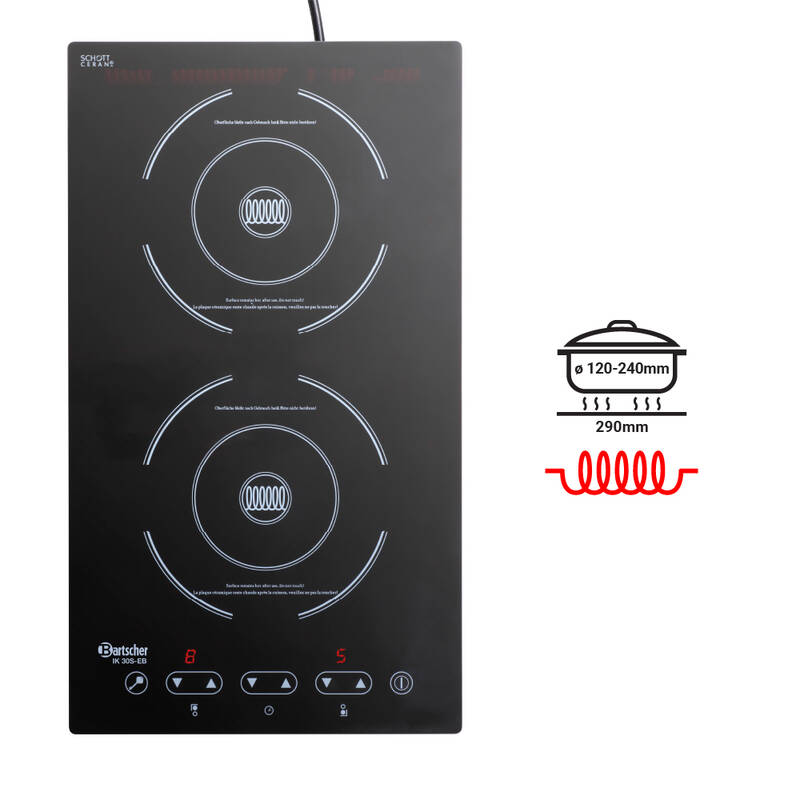 Επαγωγική εστία με δυνατότητα εντοιχισμού, εξοικονόμηση χώρου, εστίες που βρίσκονται η μία πίσω από την άλλη και μια ενιαία επιφάνεια Schott Ceran.