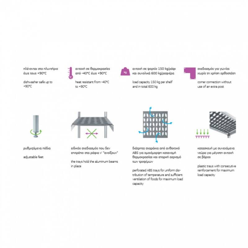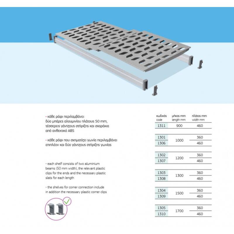 Τα ράφια συνδέονται με τους ορθοστάτες με ειδικούς πλαστικούς συνδέσμους σε διαστήματα των 150 mm (συνολικά 9 θέσεις).